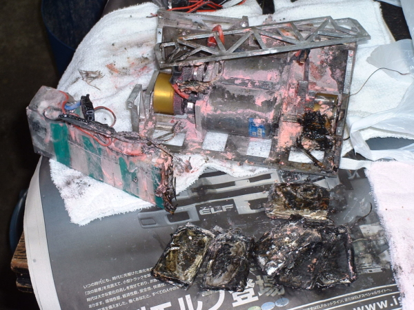 リポ発火後写真2(発火したマシンとリポです)